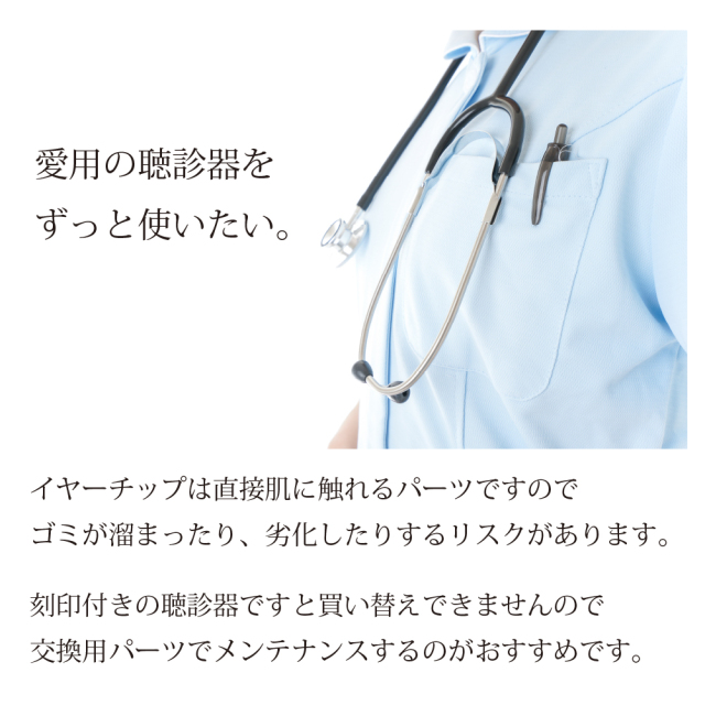 イヤーチップは直接肌に触れるパーツですのでゴミが溜まったり、劣化したりするリスクがあります。刻印付きの聴診器ですと買い替えできませんので交換用パーツでメンテナンスするのがおすすめです。