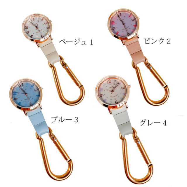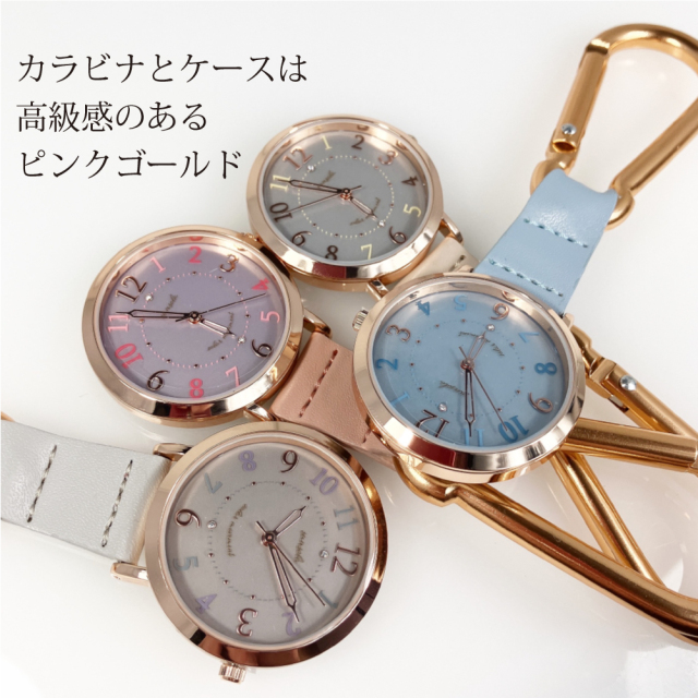 カラビナも時計ケースもピンクゴールドで統一。カラビナウォッチなので鞄やベルトに付けて外出できます。