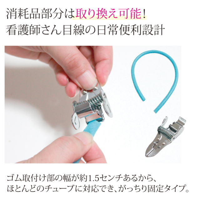 消耗品だから、取り換えも重視。どうしても取り換えが必要になるのがゴムチューブ。ピンチとセパレートだから、チューブのみで取り換え可能です。ゴム取付け部の幅が約1.5センチあるから、ほとんどのゴムチューブに対応でき、がっちり固定タイプ。ゴムが抜け落ちにくい頑丈設計です。