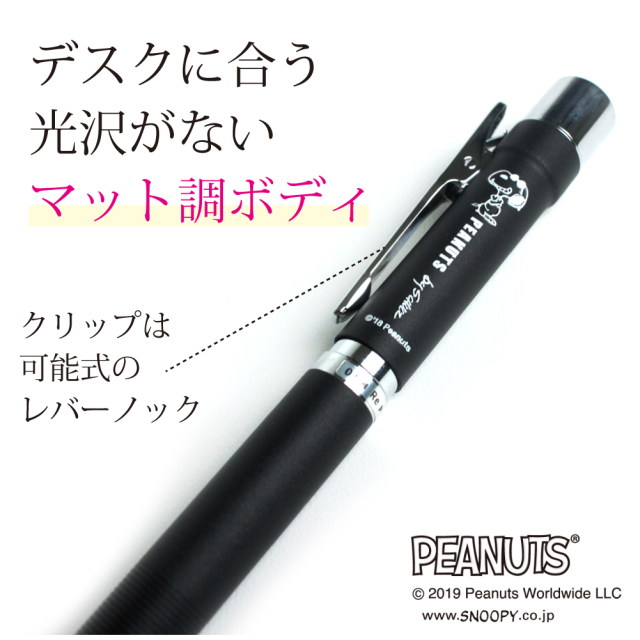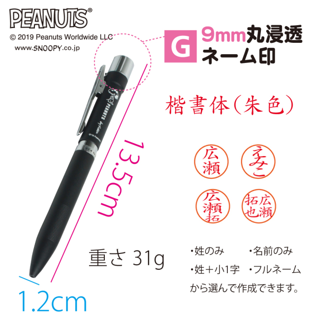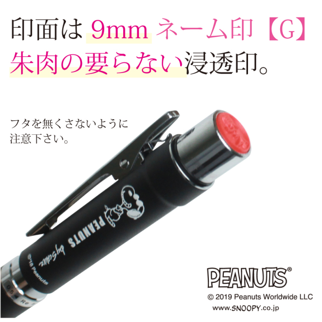 贈答品にもオススメなスヌーピー印鑑ボールペン。デスクに合う光沢がないマット調ボディ。印面は9mmネーム印【G】朱肉の要らない浸透印。ペンの中央を左右に回すと ペン種が切り替わります。