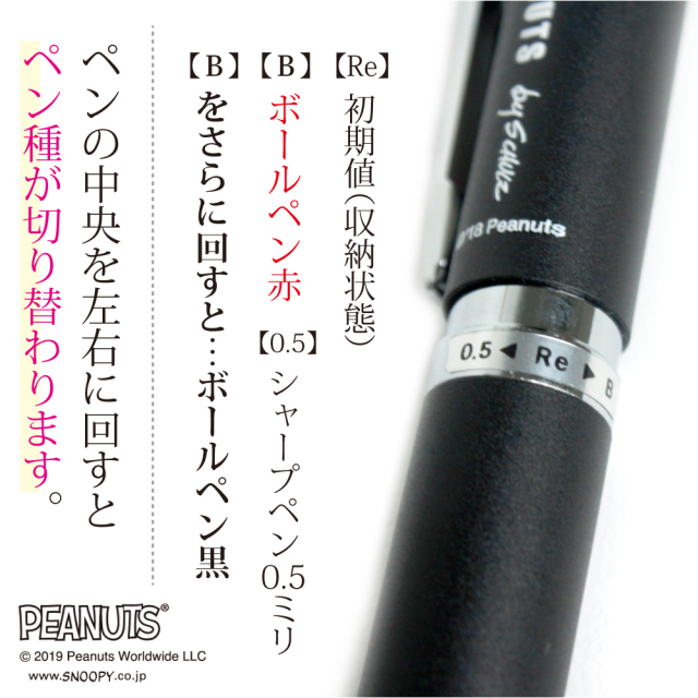 【Re】初期値(収納状態)【B】ボールペン赤 【0.5】シャープペン0.5ミリ 【B】をさらに回す→ボールペン黒 に切り替わります。