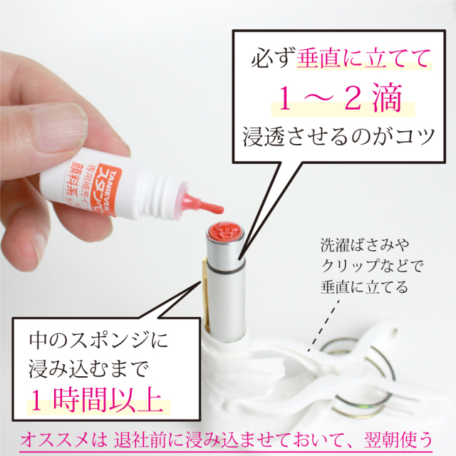 印面を上にしてインキを1から2滴補充します。補充後は補充した印面を上にして、インキが完全に印面に浸透するまで垂直に立てて置いてください。