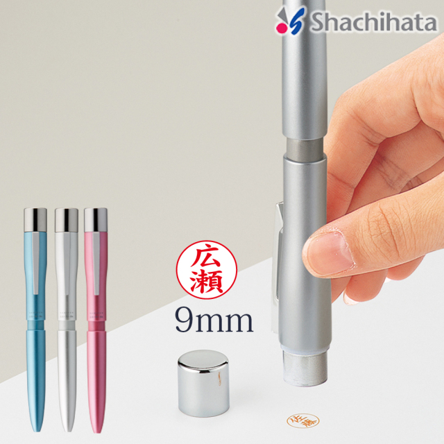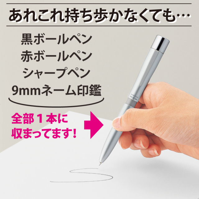 黒ボールペン、赤ボールペン、シャープペンが一体になったペンに9ミリネーム印鑑がプラス。あれこれ持ち歩かなくても1本あれば全部こなせます!