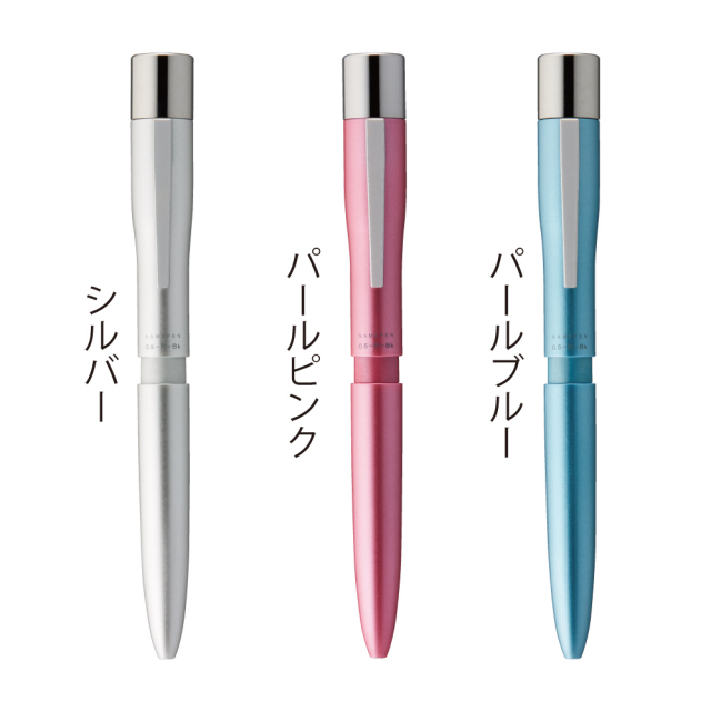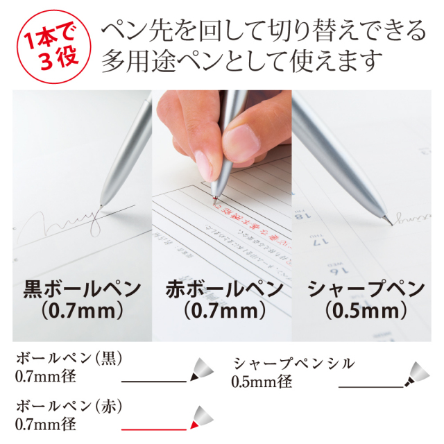 ペンとしても1本で3役こなせる優れ物!黒ボールペン、赤ボールペン、シャープペン、9mmネーム印鑑が全部1本に収まった多機能ネームペン。