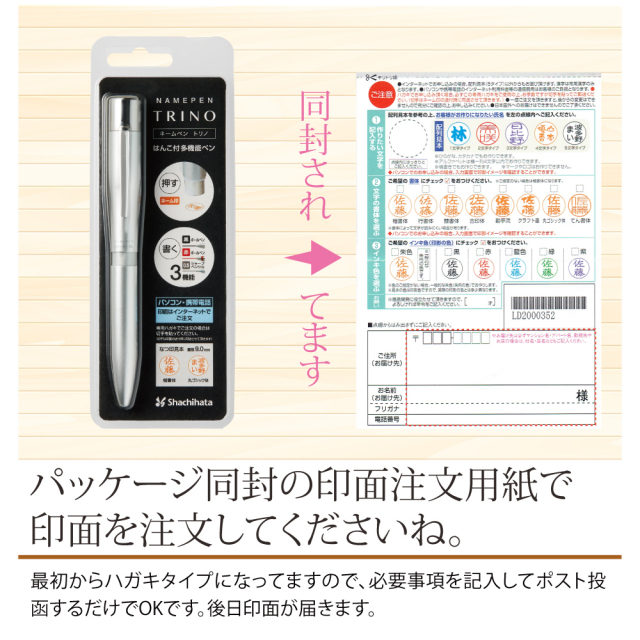 パッケージ同封の印面注文用紙で印面を注文してくださいね。