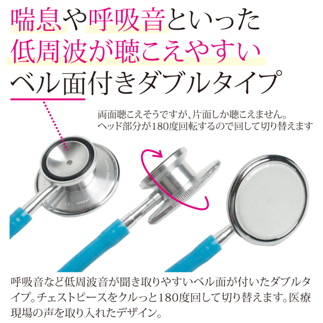 呼吸音など低周波音が聞き取りやすいベル面が付いたダブルタイプ。チェストピースをクルっと180度回して切り替えます。医療現場の声を取り入れた、握りやすさ、聞きやすさを追及したデザイン。 ※両面聴こえそうですが、片面しか聴こえません。ヘッド部分が180度回転するので回して切り替えます