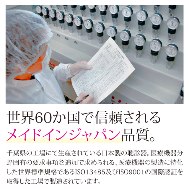 千葉県の工場にて生産されている日本製の聴診器。医療機器分野固有の要求事項を追加で求められる、医療機器の製造に特化した世界標準規格であるISO13485及びISO9001の国際認証を取得した工場で製造されています。