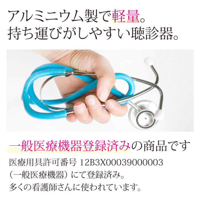 日本で作られた、アルミニウム製外ばねダブル聴診器。喘息や呼吸音といった低周波が聴こえやすいベル面付きダブルタイプ。とっても軽量、低コストなので使い勝手が丁度よい!