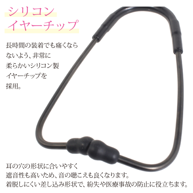 長時間の装着でもいたくならないよう、非常に柔らかいシリコン製のイヤーチップを採用しています。耳の穴の形状に合いやすく遮音性も高いため、音の聴こえも良くなります。着脱しにくい差し込み形状で、紛失や医療事故の防止に役立ちます。