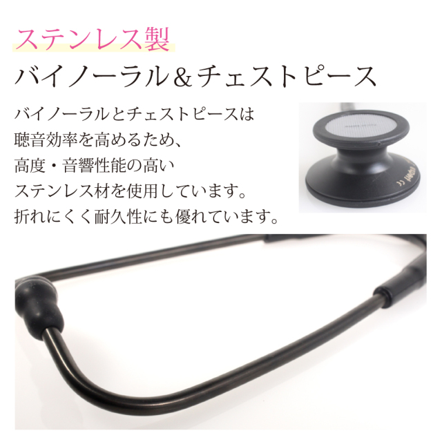 バイノーラルとチェストピースは聴音効率を高めるため、高度・音響性能の高いステンレス材を使用しています。折れにくく耐久性にも優れています。