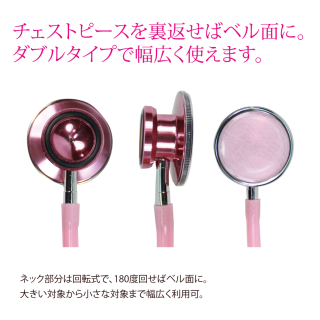 ネック部分は回転式で、180度回せばベル面に。ダブルタイプで幅広く使えます。小児や動物、精密機械などの聴診も可能です。