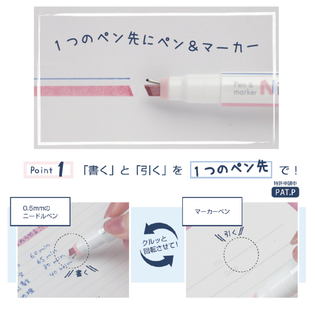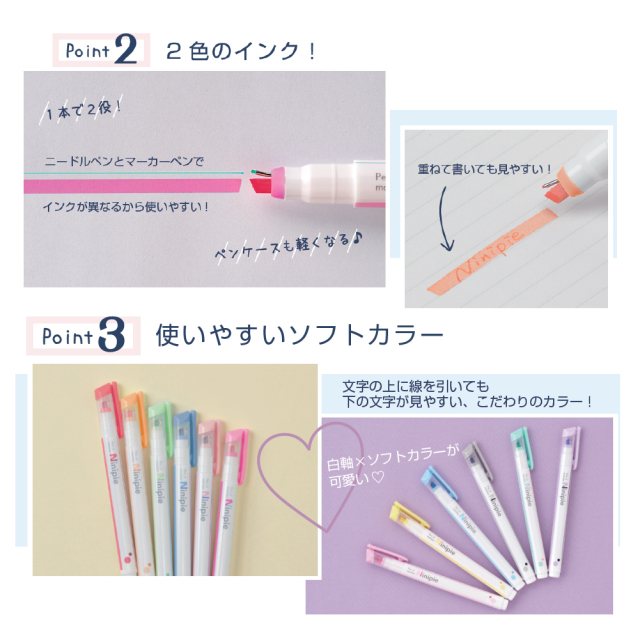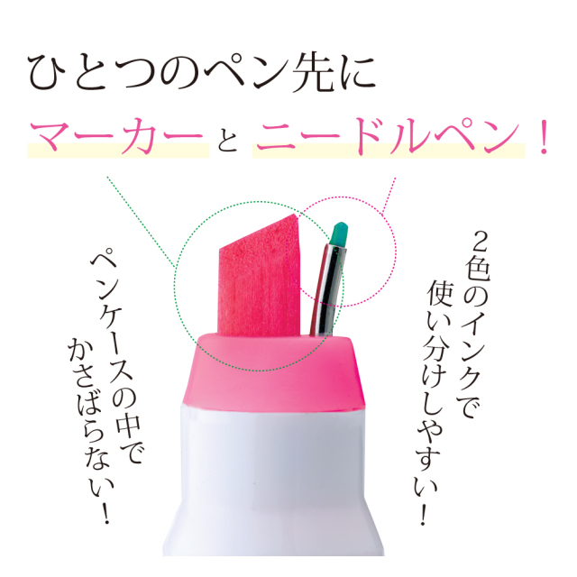 ニードルペンとマーカーペンでインクが異なるから使いやすい!重ねて書いても見やすい工夫がされています。