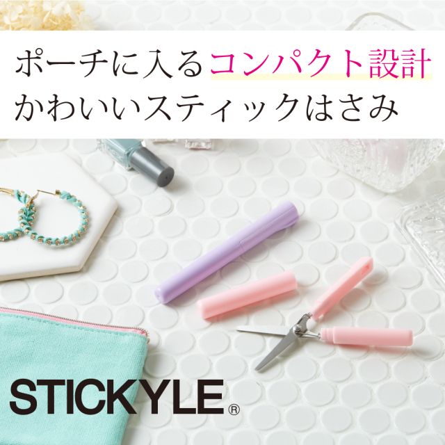 ポーチに入るコンパクト設計かわいいスティックはさみ。バネの弾性で、軽くチカラを入れるだけでラクに切れます。