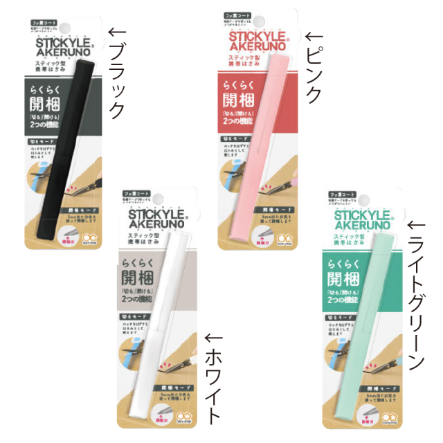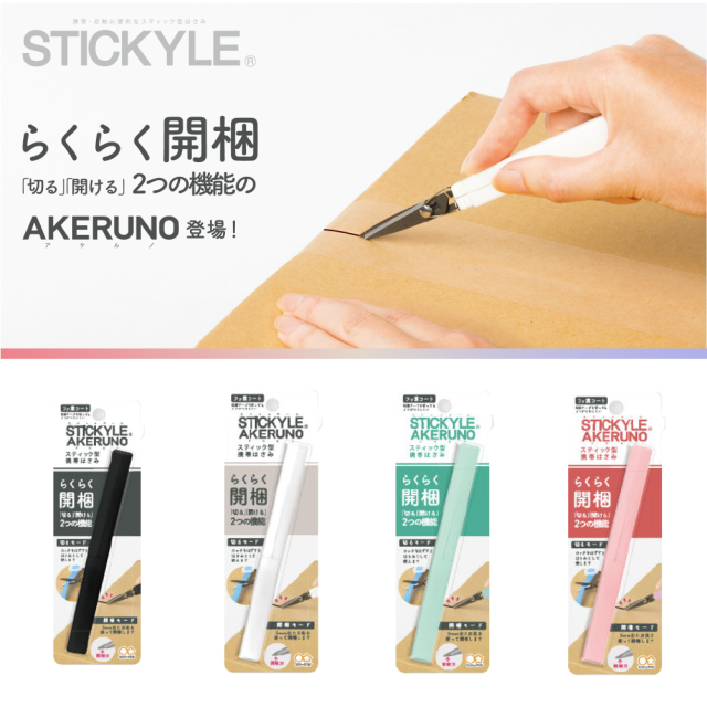 らくらく開梱「切る」と「開ける」2つの機能のAKERUNOシリーズ。女性でも使いやすいスリムな形状。細身で持ちやすく、開梱するときにはロックが掛かる安心の設計。ハサミとして使うときも力が伝わりやすい短めの刃渡りうを採用。