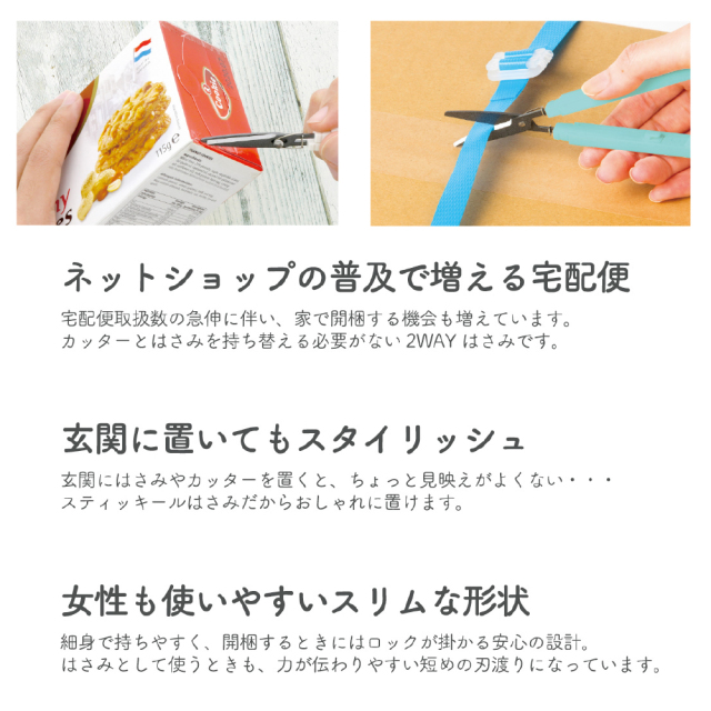 宅配便取扱数の増加に伴い家で開梱する機会も増えています。カッターとハサミを持ち替える必要が無い2WAYはさみです。