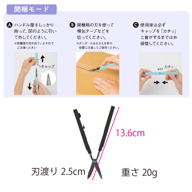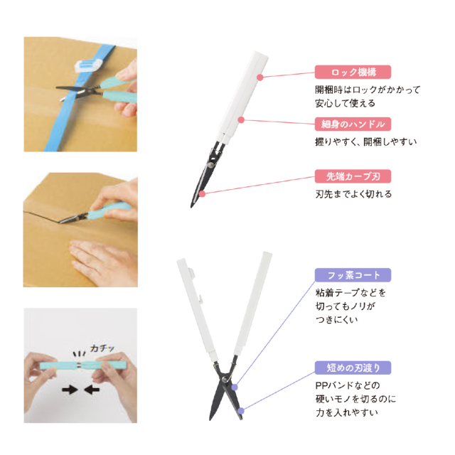 細身で持ちやすく、開梱するときはロックがかかる安心の設計。はさみとして使う時も、力が伝わりやすい短めの刃渡りになっています。