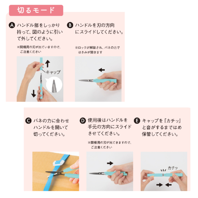 「切る」「開ける」2つの機能を1つにしたスティック型はさみ。
