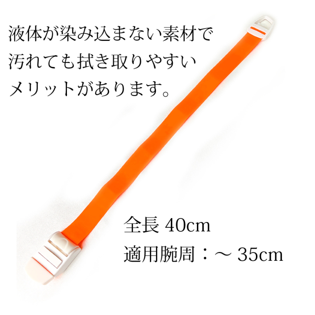 エラストマー(弾性ゴム)製のワンタッチ駆血帯(ラテックスフリー)。液体が染み込まない素材で汚れても拭き取りやすいメリットがあります。