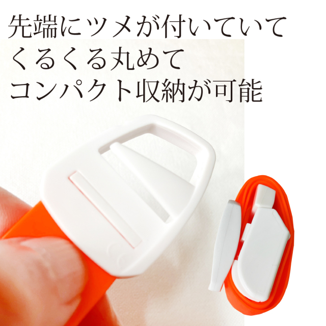 先端部分のひっかけデザインは丸め込むとコンパクトに収納可能。