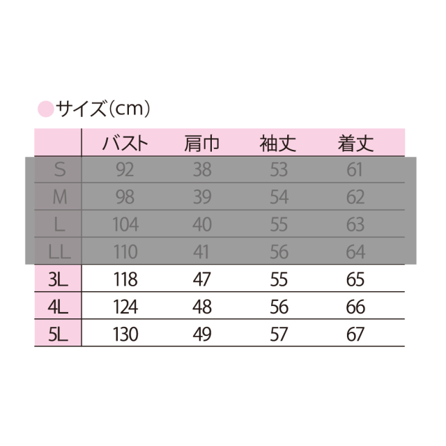 | サイズ(cm) | ・3L…バスト118 肩巾47 袖丈55 着丈65 ・4L…バスト124 肩巾48 袖丈56 着丈66 ・5L…バスト130 肩巾49 袖丈57 着丈67 |