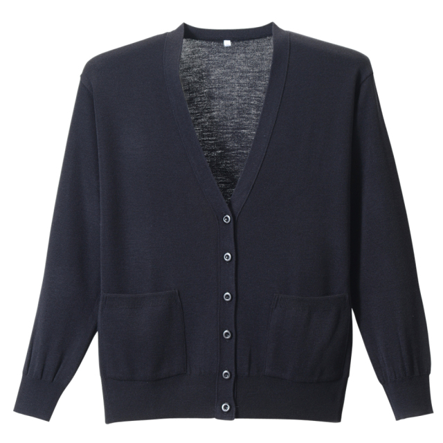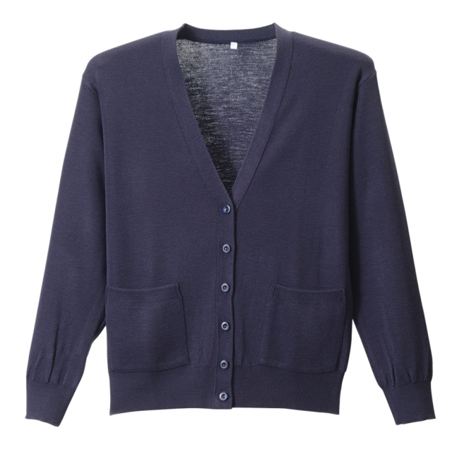 外側にポケット付きの日本製カーディガン。寒い時期やオフィスの冷房対策にぴったり。
