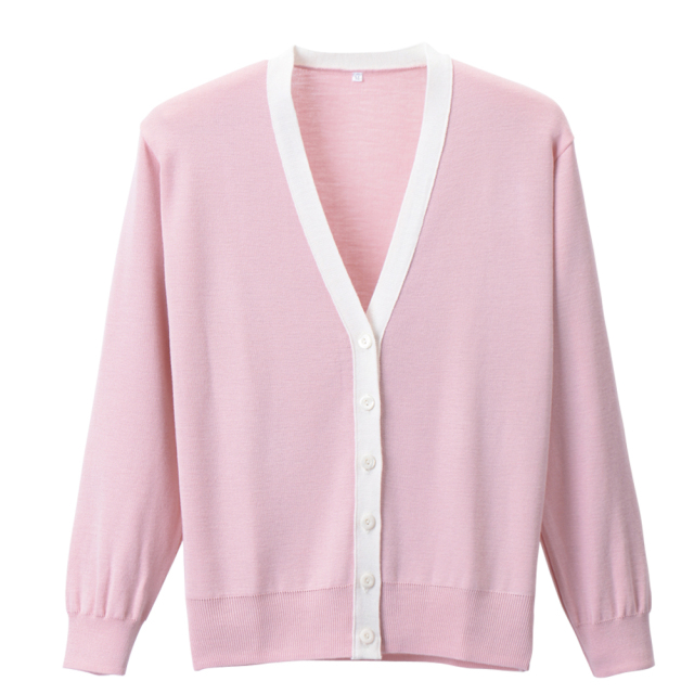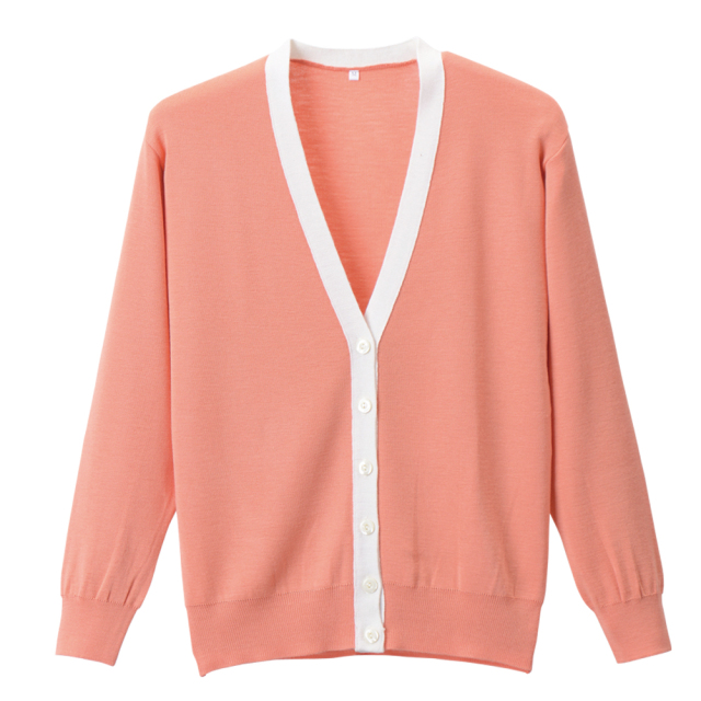 優しく軽やかな印象の襟元バイカラー、柔らかな色彩のバリエーション!抗ピル加工で毛玉になりにくいカーディガン。