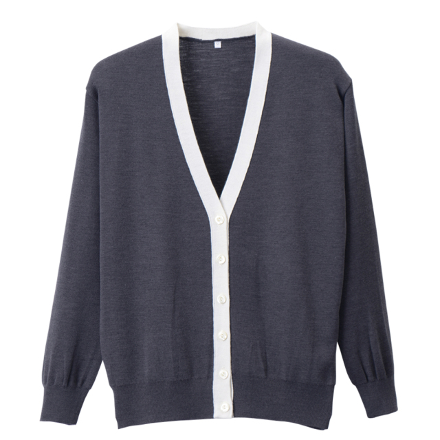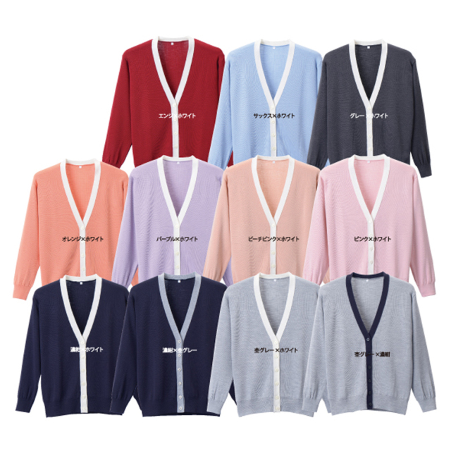 襟元が2色でカラー豊富な日本製カーディガン。寒い時期やオフィスの冷房対策にぴったり。