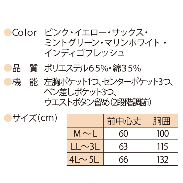 | ポケット | 左胸ポケット1つ、センターポケット3つ、ペン差しポケット3つ |