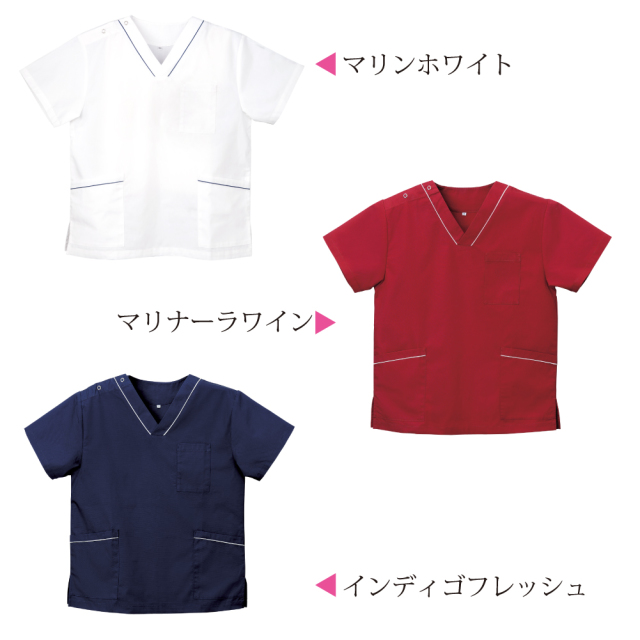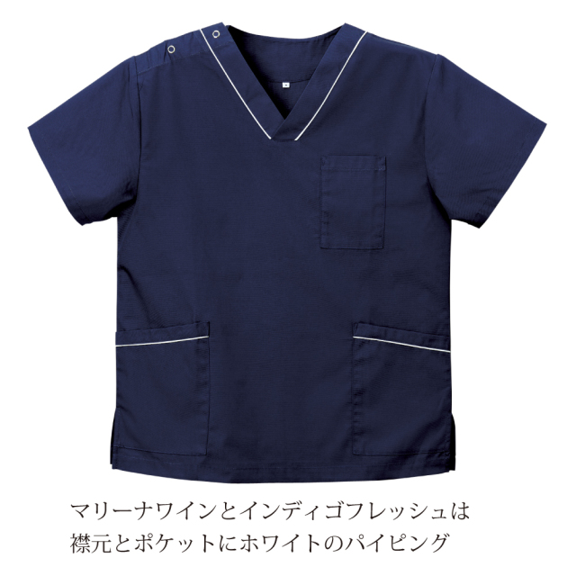 男女問わず着こなせる、カラーも豊富なスクラブです。マリンホワイトは襟元とポケットにインディゴブルーのパイピング。マリナーラワインとインディゴフレッシュは襟元とポケットにホワイトのパイピング。