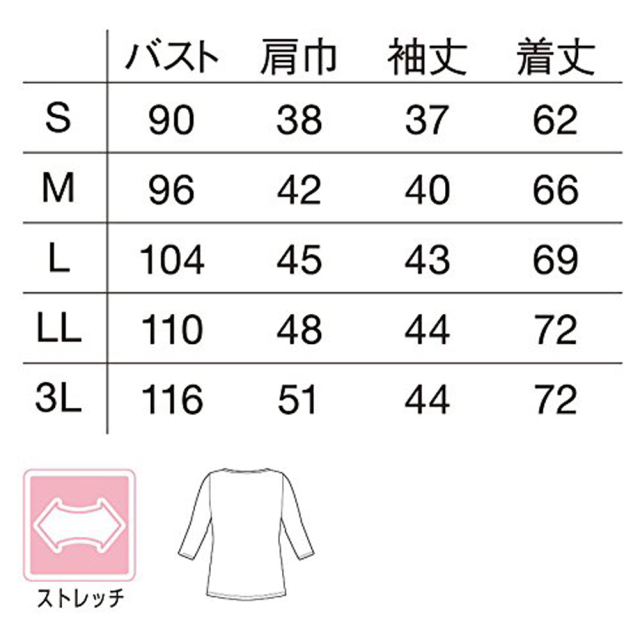 | サイズ | サイズ:S~3L(バスト90~116、肩巾38~51袖丈37~44、着丈62~72) |